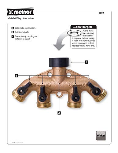 Multiply the function of your faucet. The metal 4-way hose valve converts one faucet into four separate valves. Control each valve independently with easy to use built-in controls. Keep your sprinkler set up and a nozzle handy for when you need to rinse off the car or wash the dog. Ensure you always have a leak-free seal with additional washers. Melnor has included 5 extra washers so you can easily replace them if they become lost or worn. Need additional information or assistance from Melnor? Leave a question/feedback below. We value your experience with us.